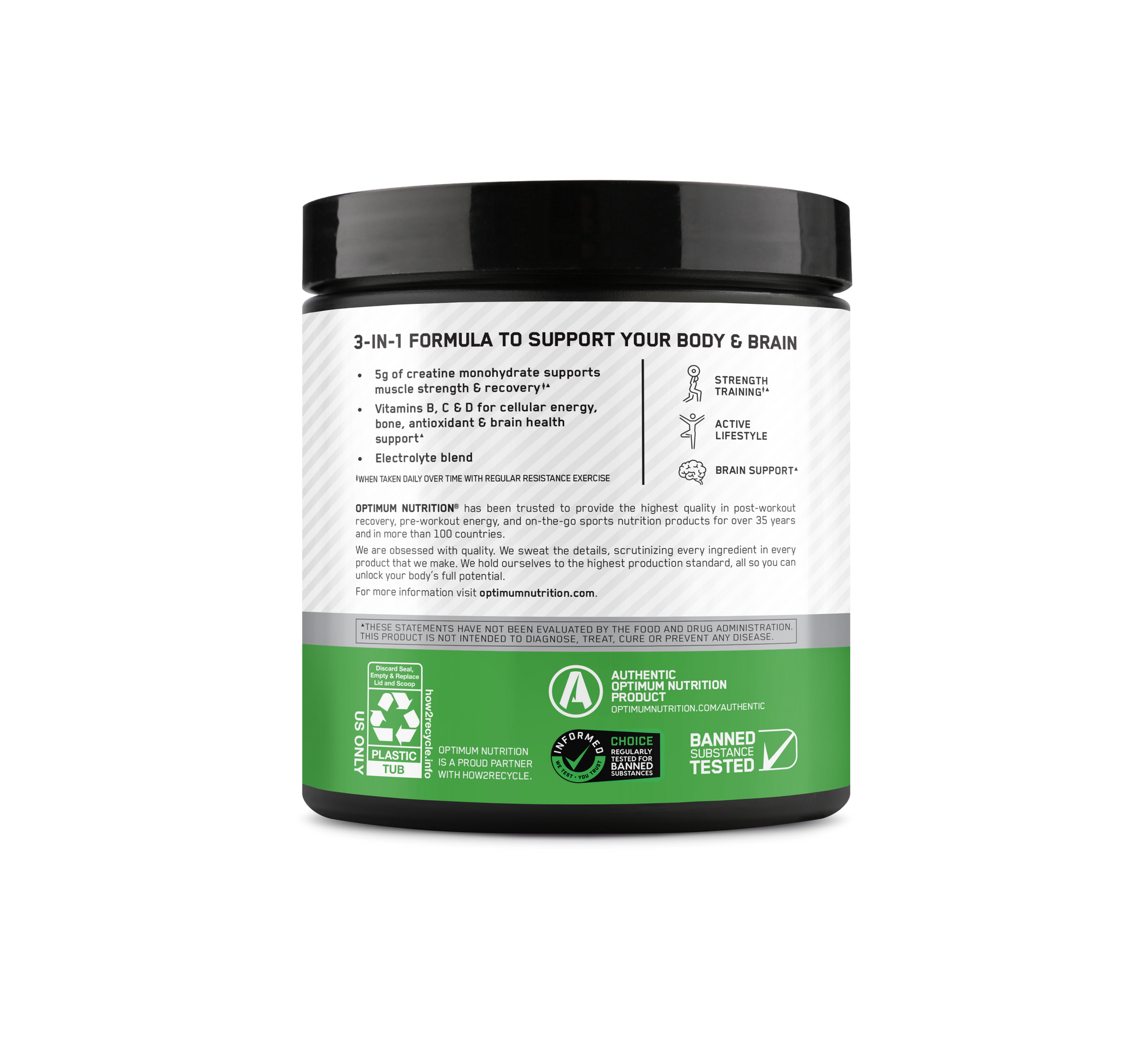 Power up your performance with Optimum Nutrition Creatine+, an advanced 3-in-1 formula designed to support muscle strength, recovery, and overall wellness. Each serving delivers 5g of pure creatine monohydrate, a precise 370mg electrolyte blend, and a targeted mix of vitamins B, C, and D to fuel your body and brain.